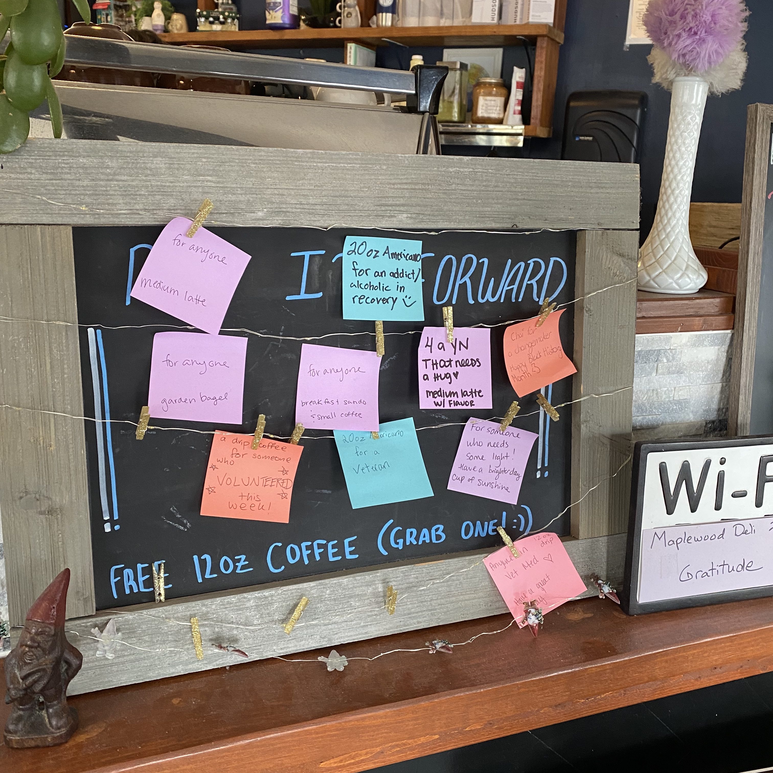 My favorite part about this cafe is that they have a ‘pay-it-forward’ board, where you can pre-pay for a coffee or a menu item and post a sticky note on the board with the item name and who the item is intended for (i.e. ‘breakfast sandwich for someone having a rough day’). It’s small touches like this that add character to these small coffeehouses.
